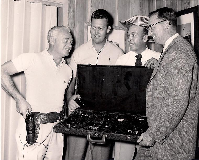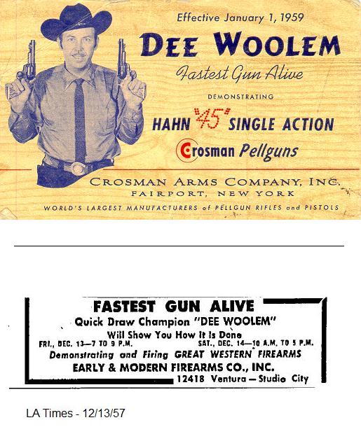 Dee Woolem – Dee Woolem was a middle-American musician. He worked as a skit actor at the Knott’s Berry Farm amusement park in the 1950’s. There he performed western plays and developed impressive gun handling skills. He went on to formalize the sport of fast draw. E&M had him on as a spokesman and endorser of the Great Western revolver in 1958. He is credited as the inventor of Great Western’s fast draw model. His notoriety led to other endorsement deals, including Crosman (air guns), and Tandy (holsters).